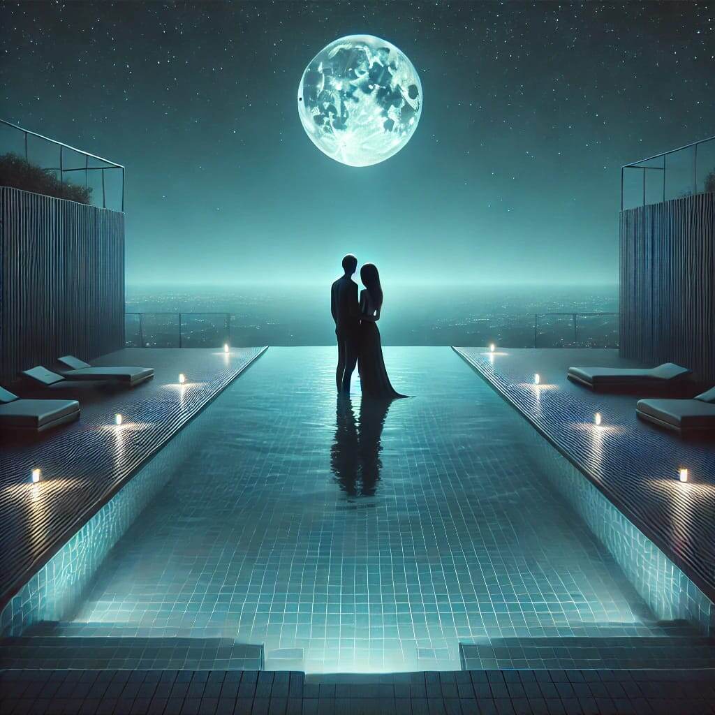 Сергей вышел на крышу 35-го этажа, вдохнув свежий ночной воздух. Бескрайний бассейн уходил в горизонт, сливаясь с морем. Вода переливалась мягкими оттенками голубого и лазурного, отражая свет полной луны, которая висела над городом, будто наблюдая за всем происходящим. Ночная Паттайя светилась тысячами огней, их отражение дрожало на водной глади. Анна находилась в бассейне, её силуэт выглядел завораживающе в игре лунного света и подсветки воды. Она расслабленно скользила руками по поверхности воды, её плечи блестели под мягким светом, а мокрые волосы струились по спине. Сергей шагнул ближе и тихо скользнул в воду. Её тёплая гладь сомкнулась вокруг его тела, создавая ощущение полного спокойствия. Анна повернула голову и улыбнулась, встретившись с его взглядом.