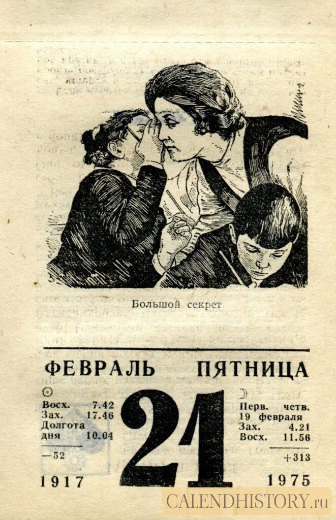Итак, сегодня 21-го февраля и у нас на календаре 1975-й год. Перед нами листок советского календаря для женщин. На календаре у нас пятница - 21 февраля 1975-го года. Большой секрет *** Оборотную сторону листка этого календаря можно посмотреть у нас по ссылке на сайте. Другие листки советских календарей смотрите у нас на сайте - CALENDHISTORY.ru ПОСМОТРИТЕ ЕЩЁ ЛИСТКИ ОТРЫВНЫХ КАЛЕНДАРЕЙ: