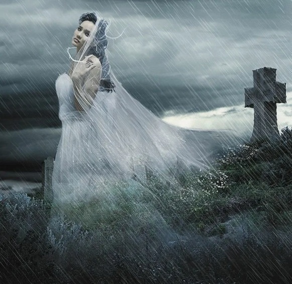 В тот осенний вечер было темно, холодно, шёл мелкий дождь. Лекции закончились поздно, я спешил домой, устал, проголодался - так что путь мой ожидаемо лежал мимо кладбища. Стояла жуткая темень, горел один-единственный фонарь рядом с кладбищенской сторожкой, так что в его свете я не сразу разглядел стоящую у стены кладбища фигуру в белом. Сначала мне показалось, что там стоит кто-то в белом халате, но потом я рассмотрел, что передо мной молодая девушка в свадебном платье и фате. Она стояла, неловко держась за стену, и выглядела не то пьяной, не то больной. Да и кто будет в здравом уме разгуливать в конце октября, в самый дождь и слякоть, в лёгком свадебном платье, да ещё и у кладбища?!