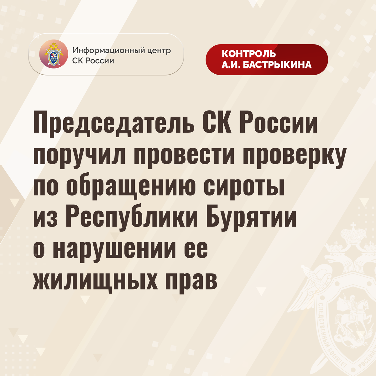 Председатель Следственного комитета Российской Федерации Александр Иванович Бастрыкин поручил руководителю СУ СК России по Республике Бурятии Евгению Вячеславовичу Лагацкому провести процессуальную проверку и доложить об установленных в хо