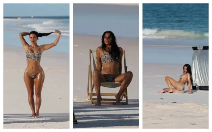Ким Кардашьян позировала в леопардовом бикини на пляже в откровенной фотосессии