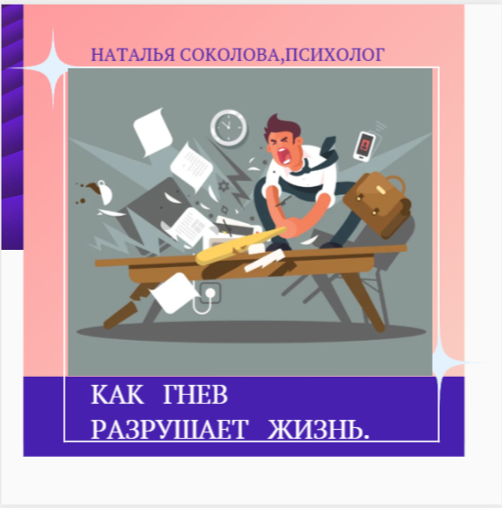 "Гнев — это кислота, которая может причинить больше вреда сосуду, в котором она хранится, чем тому, на что ее выливают". — Марк Твен В процессе взаимодействия с окружающими людьми и миром в целом мы испытываем целый ряд эмоций, в том числе и негативных. Таких как тревога, гнев, обида, подавленность, чувство стыда, чувство вины, ревности, зависти и т.д. Гнев – достаточно разрушительная эмоция, которая наносит вред нашему здоровью. По своей деструктивности она порой превосходит даже тревогу. Последствия проявления гнева: Гнев, будь то выраженный открыто, подавленный или направленный на себя, оказывает негативное влияние на различные аспекты нашей жизни. Вот лишь некоторые из наиболее распространенных последствий: • Проблемы со здоровьем: Хронический гнев – мощный фактор риска для сердечно-сосудистых заболеваний. Он повышает кровяное давление, увеличивает риск сердечных приступов и инсультов. Помимо этого, постоянный гнев ослабляет иммунную систему, делая нас более восприимчивыми к различ