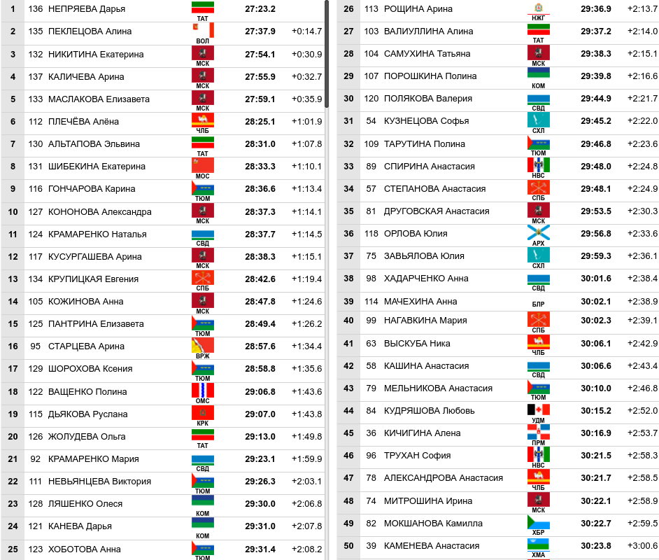 📌 "Жемчужина Сибири" (Тюменская область) Гонка 10км КЛ. Женщины Состоялась вторая женская гонка в рамках молодежного первенства России по лыжам. Прошла она под диктовку одного из лидеров и взрослого сезона Дарьи Непряевой. Дарья захватила преимущество с первых метров и ни разу по отсечкам не уступила первенства. Стоит отметить, что лишь Алина Пеклецова смогла выдержать темп Дарьи и только на втором 5 километровом кругу. Получается, что 15 секунд проигранных в первой части гонки оказались фатальными. Вообще, Алину раньше называли лыжницей с очень узкой специализацией: только разделки и главное только коньком. От неё требовали добавить в классике. И вот, мы видим первый такой успех в классическом стиле передвижения на фоне серьезных соперниц. Классика - подтянута! Интересно, будем посмотреть! Тем более, что её форма будет ещё раскрываться ближе к ЧР в Казани. Кстати, Пеклецова и её подруга Екатерина Никитина