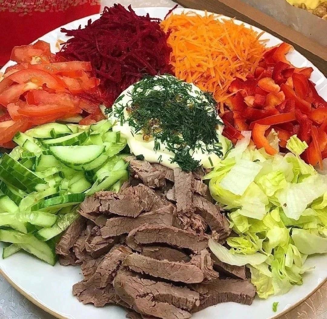 ✅Салат с говядиной 📌На 100 г 68 калорий ✅Ингредиенты: - свёкла 50 г - морковь 50 г - болгарский перец, 60 г - огурец, 50 г - пекинская капуста 60 г - мясо ( говядина ) 120 г - томаты 50 г - ПП майонез 70 г - зернистая горчица по желанию - чеснок 1 зубчик ✅Приготовление; Говядину отварить до готовности, в бульон добавить душистый перец и лавровый лист, дать покипеть 2-3 минуты и оставить мясо в бульоне на 1-2 часа остывать (тогда мясо будет сочное и ароматное). Затем мясо нарезать соломкой. Сырую морковь и свёклу натереть на тёрке для корейской морковки. Нарезать пекинскую капусту. Томаты, огурец, болгарский перец порезать соломкой. Выложить все ингредиенты на блюдо раздельно, в середину положить ПП майонез (можно майонез + сметана) с зернистой горчицей, чесночком и укропом. Перемешать уже за столом и подсолить.
