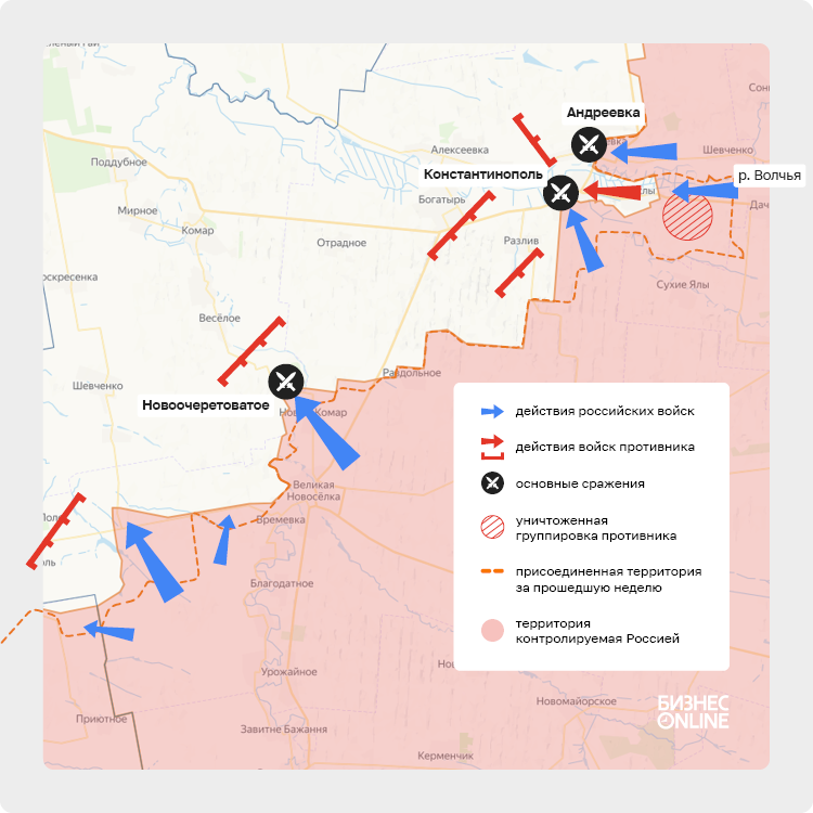 На данном участке важно то, что Константинополь, а также прилегающее к нему с севера село Андреевка, контролируют одну из двух переправ через реку Волчья. После того, как она будет занята российскими частями, останется еще одна переправа, находящаяся между населенными пунктами Богатырь и Алексеевка в 9 км западнее. После взятия второй переправы группа войск противника, находящаяся южнее и севернее Волчьей, потеряет связь друг с другом.