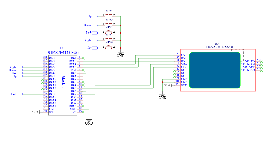 Хочу представить развлекательный проект выходного дня - простая игровая консолька, если её можно так назвать, собранная из готовых модулей: отладочной платы "black pill" на STM32F411 и модуля дисплея на ili9225 разрешением 176х220 точек. Которую можно собрать даже на макетной плате. Для сборки будет достаточно двух вышеперечисленных модулей, пяти тактовых кнопок и немного проводов. Схема подключения модулей - элементарная, даже не требует подтягивающих резисторов для кнопок: Всего реализовано 3 игры. Тетрис: Змейка: Гонки: На фото видно, что устройство собрано на объединительной плате, да ещё и с каким-то разъёмом. На самом деле, я не стал бы заморачиваться с платой ради такой безделушки. Просто, этот проект является, скажем так - "развлекательной" частью более крупного проекта (https://github.com/AndrejChoo/portable_programmer), из которого я решил просто по-быстрому вырезать ту самую "развлекательную" часть, так как она проста в повторении и может заинтересовать новичков, желающих ос