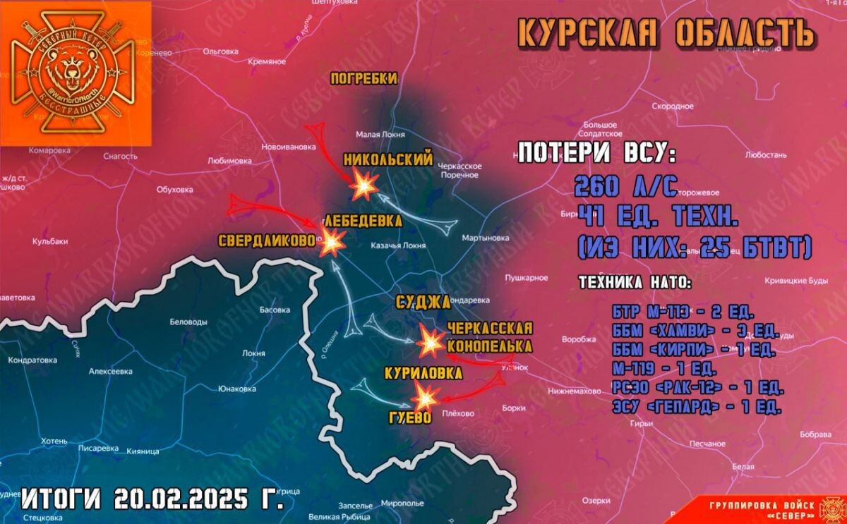 Как отмечает телеграмм-канал «Два майора», российские войска хотят продвинуться южнее Свердликово в сторону Новенького и Басовки. Пока достоверных данных на сегодняшний момент нет. «В районе самого районе Свердликово войска РФ продолжают атаковать в направлении расположенного восточнее села Лебедевка», - сообщает автор. Активные действия со стороны военных РФ идут на западном берегу реки Псёл севернее Гуево. Подразделения ВДВ Северян продолжают перемалывать превосходящие силы противника, продвигаются на Запад в окрестностях Черкасской Конопельки. Отмечается, что враг постоянно перебрасывает через окрестные леса живую силу, пытаясь остановить продвижение десантников. Морпехи ведут упорные бои в окрестностях хутора Никольский и в самом населенном пункте. Они там выбили противника из двух опорных пунктов. Также морпехи продолжают уничтожать противника из лесополос в окрестностях Куриловки. Отсюда они могут пойти на штурм районного центра или же, продвинувшись на Запад, перерезать один из