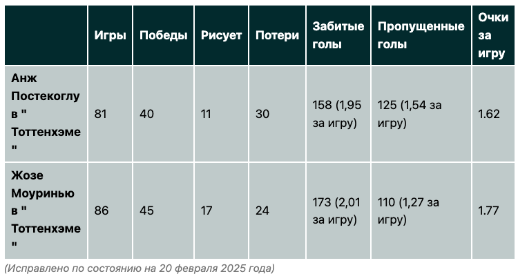 Вот их статистика в «Тоттенхэме». Несмотря на то, что Моуринью называют оборонительным менеджером, его «Тоттенхэм» забивал больше, чем у Постекоглу, и пропускал меньше голов.