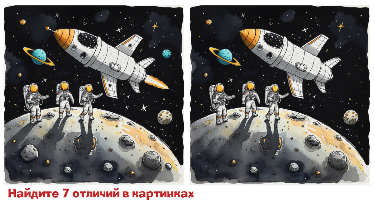 Помни: "Тот, кто замечает мелочи, легко найдёт дорогу даже в бесконечности!" Космонавты бороздят просторы галактики. Изучают астероиды, наблюдают за кометами… Но подождите-ка, что-то изменилось? Или это просто эффект невесомости? Найди 7 отличий и стань настоящим звездным исследователем! Горизонтальная картинка: Вертикальная картинка : Никаких шансов у отличий спрятаться от тебя. Пусть день будет тёплым, а настроение — солнечным. До скорого!