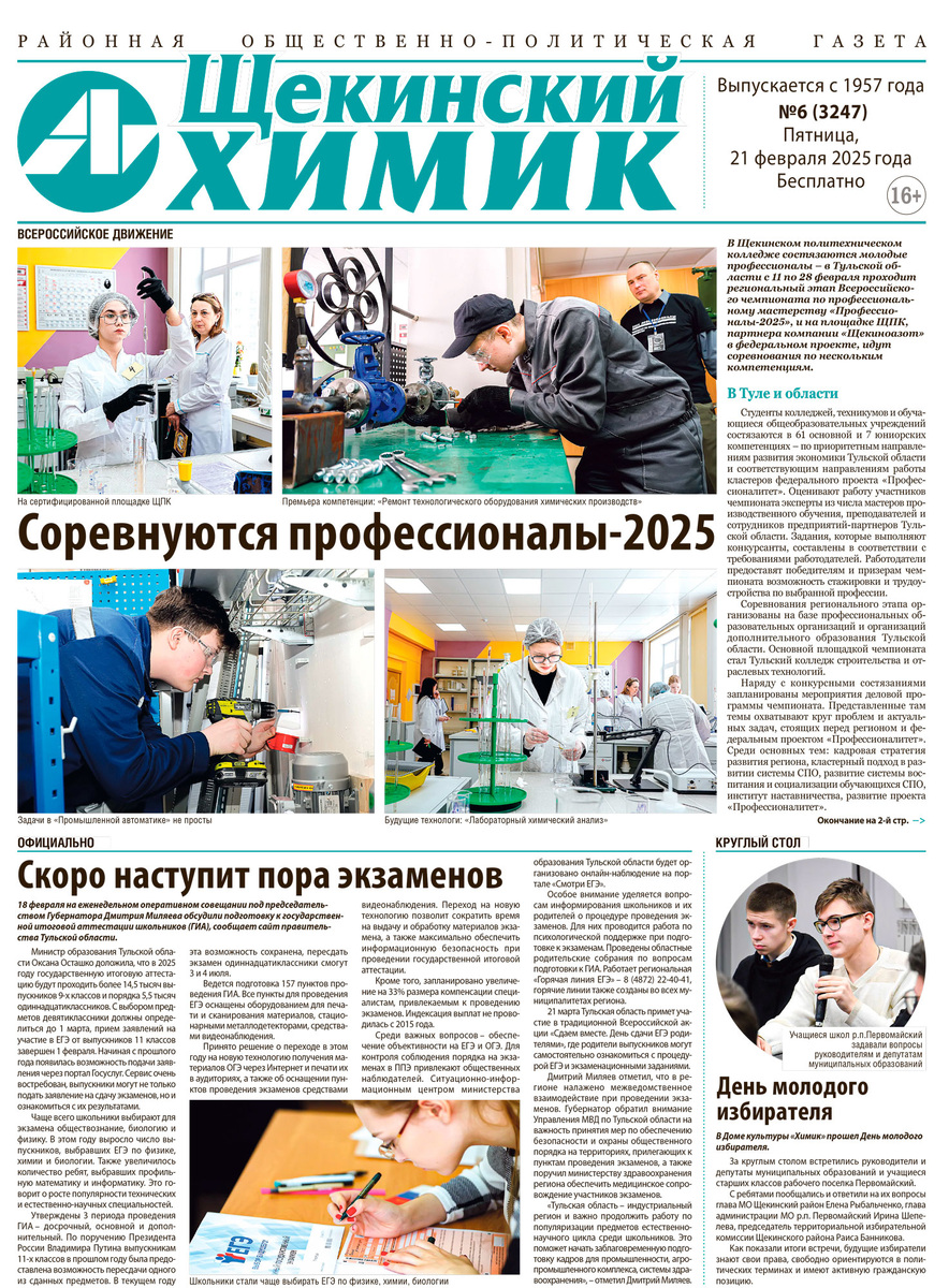 И, как всегда, верна читателю газета «Щекинский химик». На ее страницах вы найдете новости о происходящем в разных сферах жизни города и района, узнаете знакомые лица земляков и почерпнете актуальные сведения. Сегодня в выпуске: – Региональный этап Всероссийского чемпионата профессионального мастерства – на площадке Щекинского политехнического колледжа, партнера компании «Щекиноазот» в ФП «Профессионалитет»; – Наши люди – лучшие инженерные умы «Щекиноазота», лауреаты конкурса «Инженер года-2024»; – Приближается пора экзаменов в школах – какие новшества ждут выпускников; – Навстречу 80-летию Победы – ветеран Великой Отечественной войны, славный труженик «Азота»; – Широкие горизонты – для практикантов на предприятии; – Новости культуры и спорта; – Актуальные вакансии в компании «Щекиноазот». Газета распространяется бесплатно! Получайте «ЩХ» в точках выкладки (адреса – ниже). Есть новости? Редакция – на связи: +7(48751)9-28-98, konik@azot.net