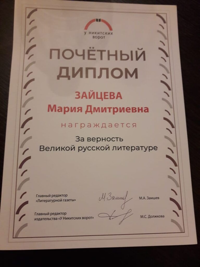 Награда академику ИАСК Зайцевой-Гольберг М.Д. за верность русской литературе