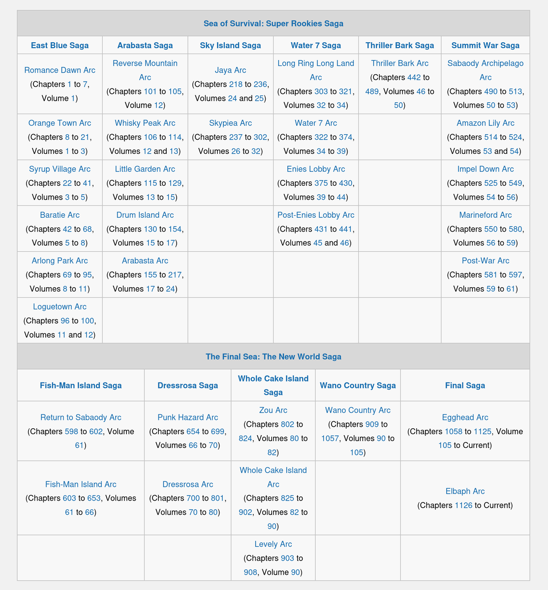 Первый крупный конфликт на Гранд Лайне. Сага значительно расширяет масштаб приключений, показывая опасности Гранд Лайн, знакомя с системой Шичибукаев и демонстрируя, как команда Луффи становится настоящей силой, способной влиять на целые королевства.