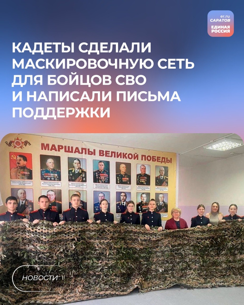 🪖Акция была приурочена ко Дню Защитника Отечества. Учащиеся школы №43 им. В.Ф. Маргелова продолжают делать маскировочные сети для военнослужащих, участников специальной военной операции. Юные волонтёры трудятся в свободное от учебы время и передают готовые камуфляжные полотна активистам партийного проекта «Женское движение Единой России» для дальнейшей доставки нашим бойцам. Также в преддверии Дня защитника Отечества ребята написали теплые письма бойцам. Уже завтра они будут доставлены ребятам в Саратовский госпиталь. 💬«Каждая маскировочная сеть - наш вклад в общее дело, ведь надёжный тыл — это опора фронта! Ребята верят, что даже маленький вклад приблизит наших земляков к долгожданной Победе», - отметила активистка партийного проекта «Женское движение Единой России» Елена Гуркина. Стоит отметить, что материала для маскировочных сетей бы приобретен родственниками участника СВО.