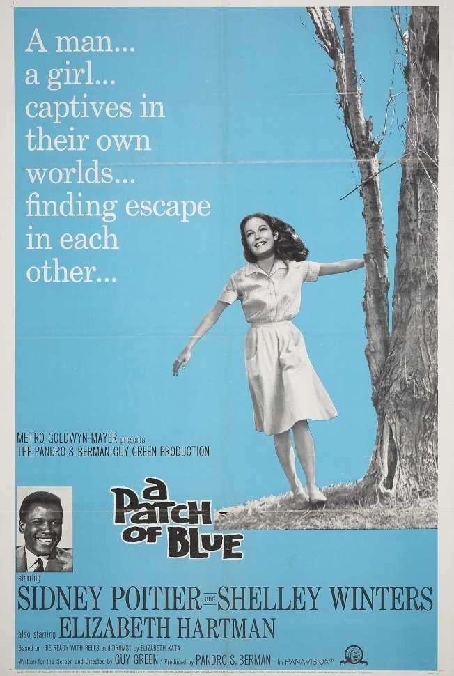 Сидни Пуатье - парень хоть куда! Ещё и актёр замечательный. Из всех чёрных артистов (негров, то бишь) он, пожалуй, самый великолепный. Имеется в виду золотая эпоха синематографа, конечно. Ибо в сегодняшнем кинобизнесе чёрных больше половины - поди их разбери: один качок, другой сморчëк - и всяк норовит занять место под солнцем. Пуатье - актёр-интеллектуал. Его харизма видна в каждом фильме. В любой роли он всегда на голову выше своих белых оппонентов. Он тот, кем любуется камера. Итак "Patch of Blue"... Слепая девушка Селина (Элизабет Хартман), ставшая таковой в пятилетнем возрасте, благодаря бесшабашности своей мамаши живёт во тьме. Ей 18, она не развита, не грамотна, но умна и добра. Живёт с матерью-проституткой (Шелли Уинтерс сыграла тут такую отвратительную лохудру, что можно апплодировать стоя) и с дедом-алкоголиком (Уоллес Форд). Она работает, собирая бусы, а деньги за труд отбирает мамаша и дедуля. Диалоги и склоки последних двух - шедевр маргинальных сцен. Иногда Селину утро