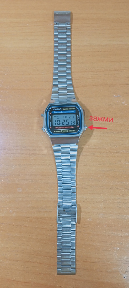 1.Начнем с самого простого:положите часы перед собой, найдите правую нижнюю кнопку и нажмите на ЗАЖМИТЕ её: Отлично, зажали. После того как вы зажали правую нижнюю кнопку на часах должна появиться надпись CASI0: 2. Второе что должен проверить каждый владелец часов Casio это качество гравировки сзади на корпусе и на защёлке браслета, а так же винты, очень важная часть оригинальных casio на подделках стоят обычные винты, а на часах Casio оригигинальые с завода: Если вы увидели надпись MADE IN CHINA, не переживайте, у компании Casio есть заводы не только в Японии, но и в Китае! Что на крышке, что на зещелке браслета, обязательно должна быть качественная гравировка. А еще, можно посмотреть на регулятор самого браслета: На регуляторе браслета должна быть вот такая стрелочка, она предназначена для того, чтобы направить владельца часов на правильную настройку браслета(подсказка) это тоже подверждает подлинность часов Casio. Последнее что хочу сказать на счет часов Casio A168:расположение всех
