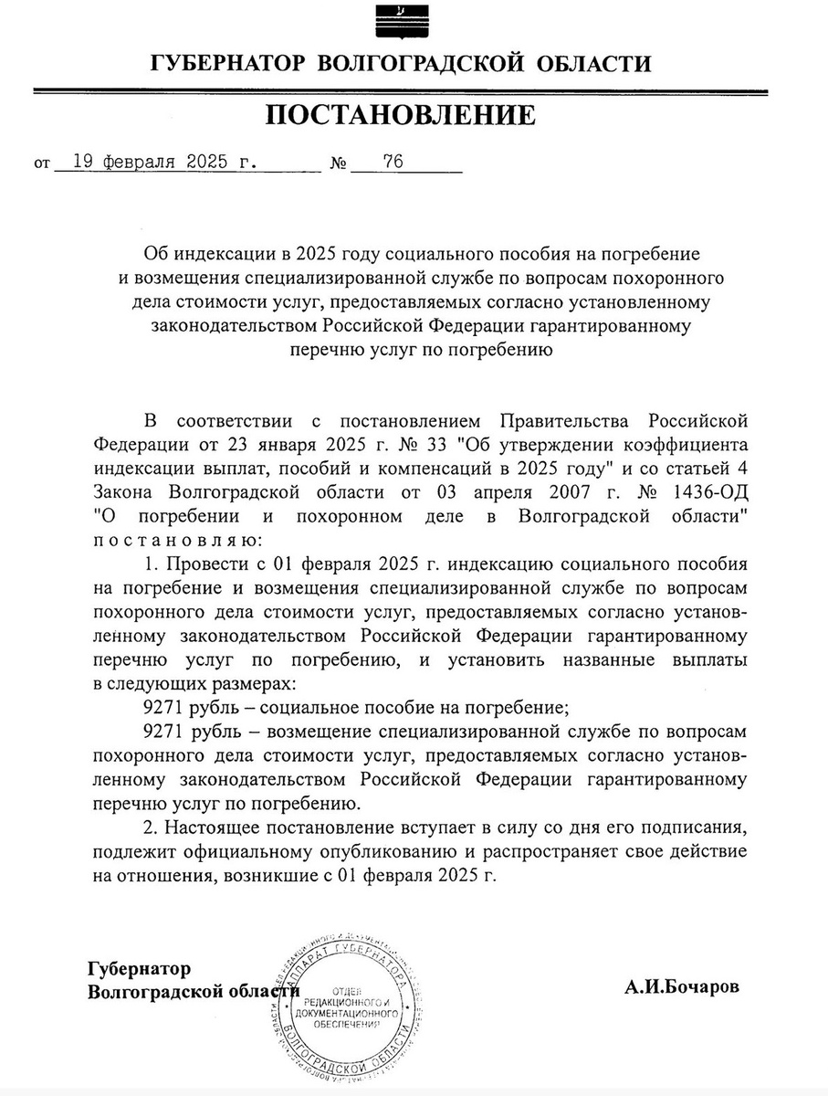 В Волгоградской области снова повысили сумму социальных выплат на погребение. Соответствующее постановление было размещено на сайте обладминистрации. Согласно постановлению, с 1 февраля текущего года решили проиндексировать социальные выплаты на погребение и возмещение специализированной службе по вопросам похоронного дела стоимости услуг. Речь об услугах, предоставляемых, согласно установленному законодательством РФ, где для умершего гарантируется конкретный перечень. Так, похоронные выплаты увеличили на 804 рубля. Последний раз сумма выплат повышалась год назад. Тогда соцвыплаты и возмещение похоронным конторам составила 8467 рублей. Теперь эта сумма составляет 9271 рубля. Постановление вступило в законную силу со дня его подписания. Стоит отметить, что в этом году выплаты решили повысить куда больше, чем в прошлом году. Так, в феврале 2024 года сумму увеличили на 584 рублей. В 2023 году выплаты составляли 7884 рубля. Еще годом ранее, в 2022-м, – 7046 рублей. В 2021 году выплачивали