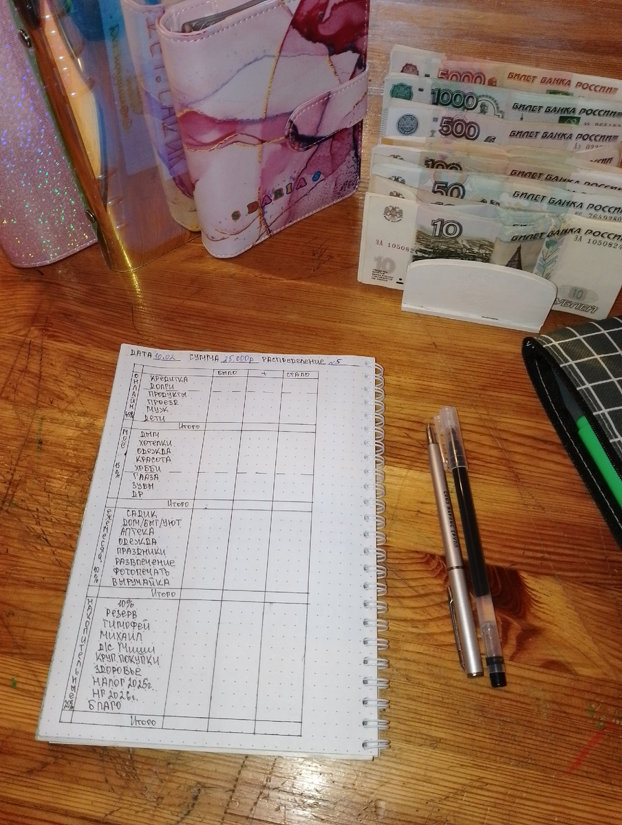 На распределение у нас сегодня 25.000 рублей, остальное муж оставил себе, на свои траты.