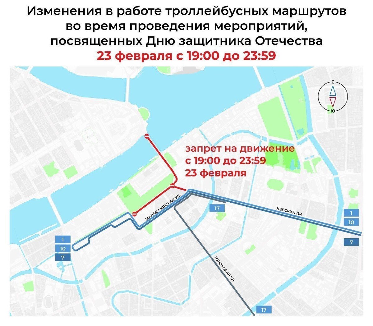 В Петербурге для проведения мероприятий, посвящённых Дню защитника Отечества, 23 февраля в центре города введут временные ограничения в движение транспорта, сообщили сегодня в пресс-службе «Организатора перевозок». «С 00:00 до 23:59 на четырёх участках дорог будет запрещена остановка транспорта, – говорится в сообщении. – С 19:00 до 23:59 часов на десяти участках дорог будет запрещено движение транспорта». Кроме того, вводятся временные изменения в движение десяти маршрутов городского наземного транспорта: пяти автобусных маршрутов – №2, 7, 10, 24, 191, а также пяти троллейбусных – №1, 7, 10, 11, 17. Ранее «Петербургский дневник» сообщал, что в четырех районах Петербурга с 24 и 25 февраля ограничат дорожное движение.