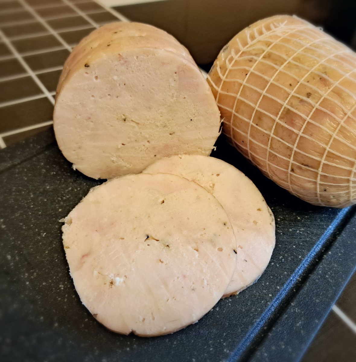 - Вынимаем через сутки, добавляем специи любимые, делаем рулет в целлюлозе и сетке, оставляем на 2 часа в тепле.