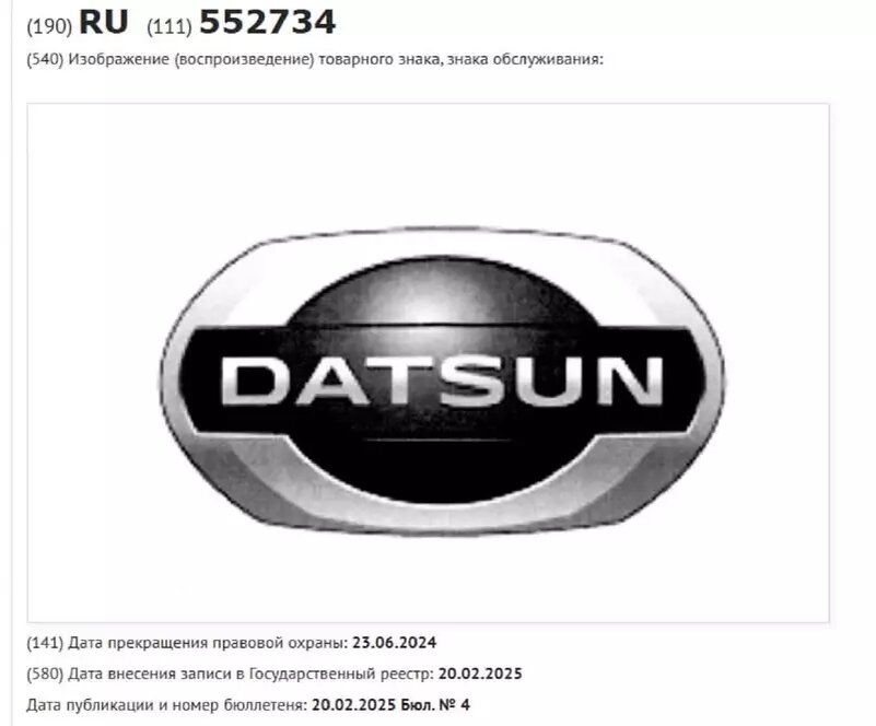 Роспатент прекратил правовую охрану логотипа Datsun – этот бренд принадлежит японской компании Nissan. Соответствующая запись об этом появилась в государственном реестре 20 февраля 2025 года, однако сама правовая охрана прекратилась еще 23 июня прошлого года.