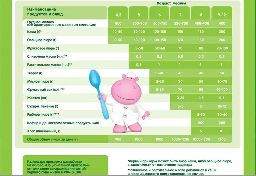 В 6 месяцев в рационе ребенка появляются первые прикормы. Основные продукты включают: