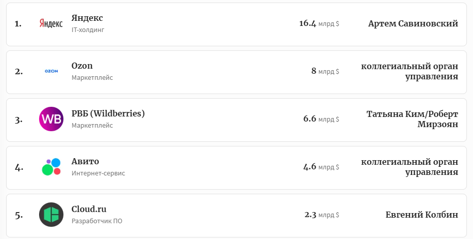 Forbes представил рейтинг самых дорогих компаний Рунета. Лидером рейтинга по итогам 2024 года стал Яндекс. По данным, издания стоимость компании составила $16,4 млрд. Второе и третье место заняли Ozon и Wildberries. Стоимость компаний аналитики оценили в $8 млрд и $6,6 млрд соответственно. Также в десятку лидеров вошли: Avito ($4,6 млрд), разработчик ПО Cloud.ru ($2,3 млрд), «Лаборатория Касперского» ($1,8 млрд), HeadHunter ($1,8 млрд), разработчик ПО «СКБ Контур» ($1,8 млрд), разработчик ПО 1С ($1,7 млрд), разработчик ПО «Леста игры» ($1,5 млрд). По подсчетам Forbes, капитализация 30 крупнейших интернет-компаний выросла за год с $55 млрд до $59 млрд (+7% в долларовом выражении). Напомним, ранее эксперты подсчитали, что выручка 100 крупнейших EdTech-компаний России выросла в 2024 году на 19%.