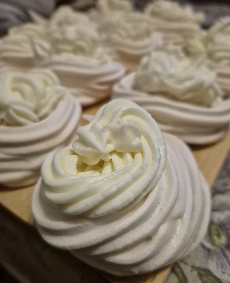 Готовим меренгу (основу десерта): У куриных яиц отделить белки от желтков так, чтобы ни одна капля желтка не попала в белок. Добавить к белкам щепотку соли и взбить до бела. Сахар размолоть в пудру и добавить к взбивающимся белкам. Взбивать бо устойчивых пиков. Добавить крахмал и сок лимона (потихоньку выжимая по краю миски для взбивания). Взбивать еще минимум 5 минут. Выложить полученную белковую массу в кондитерский мешок и при помощи удобной Вам насадки выложить на противень сначала донышко будущего десерта, а затем стенки (должна получится маленькая чашечка-мисочка). Полученные формочки положить в духовку, разогретую до 160 градусов, убрав при этом сразу температуру до 100 градусов. Выпекать 1,5 часа при 100 градусах. Готовим фруктовый крем: Желтки взбить до бела с сахарной пудрой. Добавить крахмал, снова взбить. Добавить фрукты, продолжать взбивать. Добавить масло, взбить. Переложить массу в сотейник и на среднем огне, постоянно помешивая венчиком, варить до загустения крема. Накр