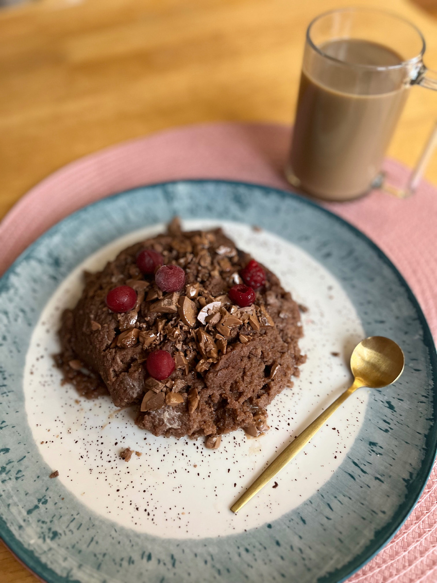 я сладкоежка и всегда ищу для себя полезные и вкусные рецепты, особенно для меня важно чтоб завтрак был максимально вкусным и укладывался в мой калораж. этот рецепт мне очень понравился, тем более набор ингредиентов очень маленький а брауни получается очень вкусным, не смотря на то, что сделан без муки, сахара и масла. Ингредиенты: Яблоки очистить, порезать кубиком Измельчить в блендере, добавить яйца, разрыхлитель и какао Вылитьв форму и выпекать в духовке минут 30 при 180 с., но так как у меня духовки нет, я поставила в микроволновку на 4 минуты Сверху украсила ягодами и кусочком шоколада. Приятного аппетита!