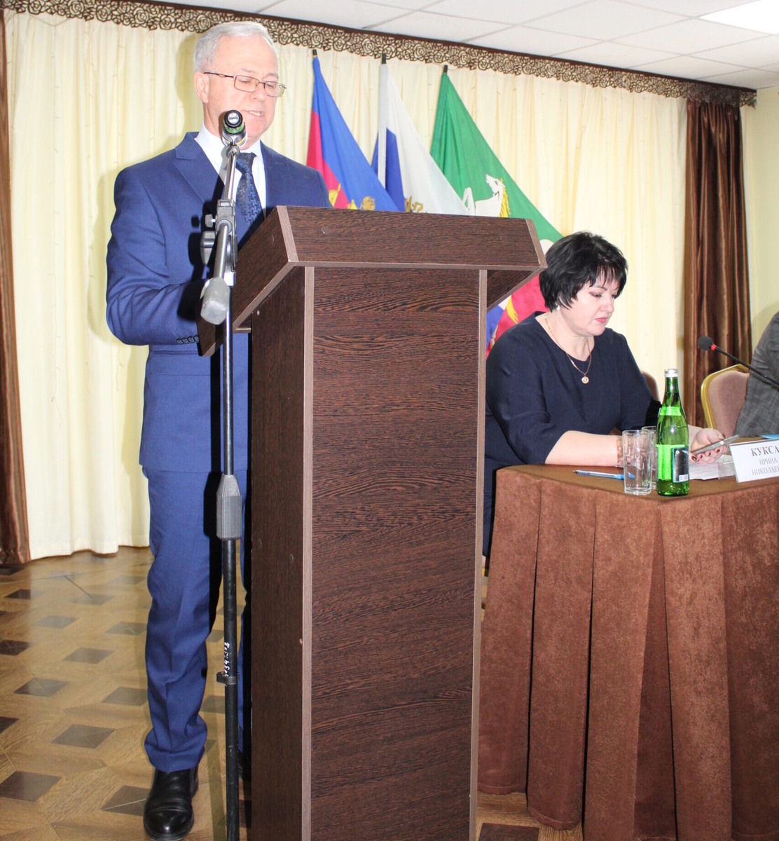 В зале собрались представители органов власти, депутатский корпус, ТОСовцы, жители станицы. В президиуме заседали заместитель главы района Дмитрий Агашков и председатель Совета муниципалитета Михаил Кряжов.