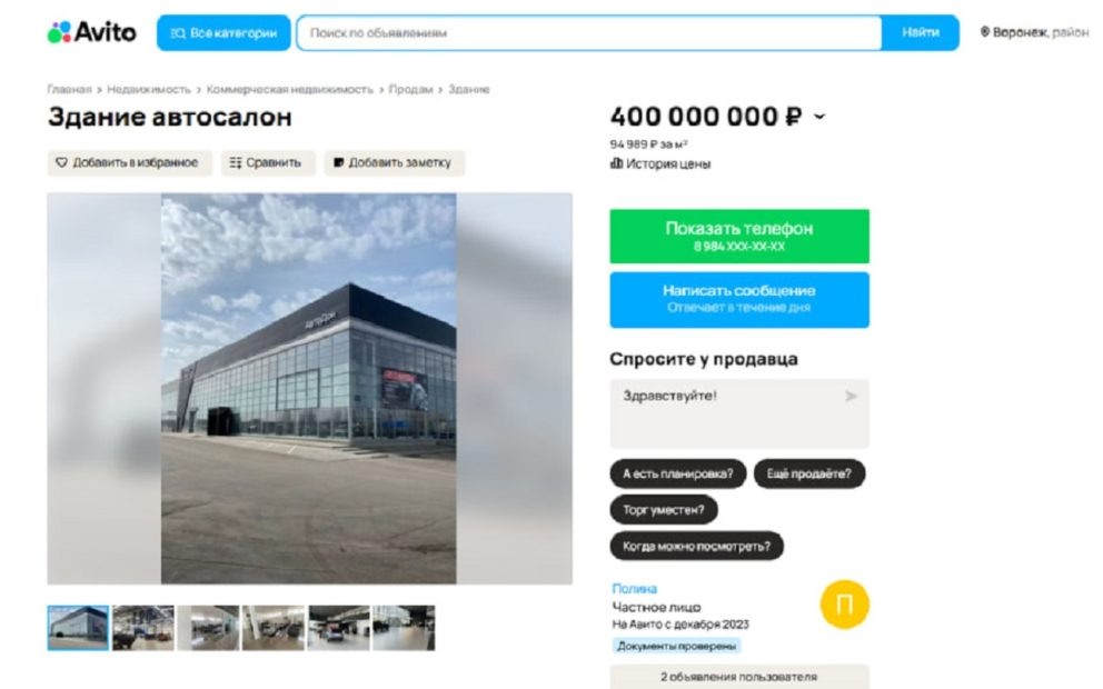 В Воронеже выставили на продажу автосалон, расположенный на улице Изыскателей, 39д. Согласно информации, опубликованной на сайте бесплатных объявлений «Авито», стоимость здания оценили в 400 млн рублей. Автор объявления указал, что двухэтажное многофункциональное коммерческое помещение площадью 4,2 тысячи кв. м оснащено необходимым оборудованием и в настоящий момент используется для продажи автомобилей различных марок. Судя по фотографиям, в нем располагается компания по продаже и ремонту машин «АвтоДон». Автосалон расположен на въезде в город на федеральной трассе М-4 «Дон» со стороны Новой Усмани. Собственник отметил, что есть возможность продажи здания вместе со всем оборудованием. На территории также предусмотрена парковка на 60 автомобилей.