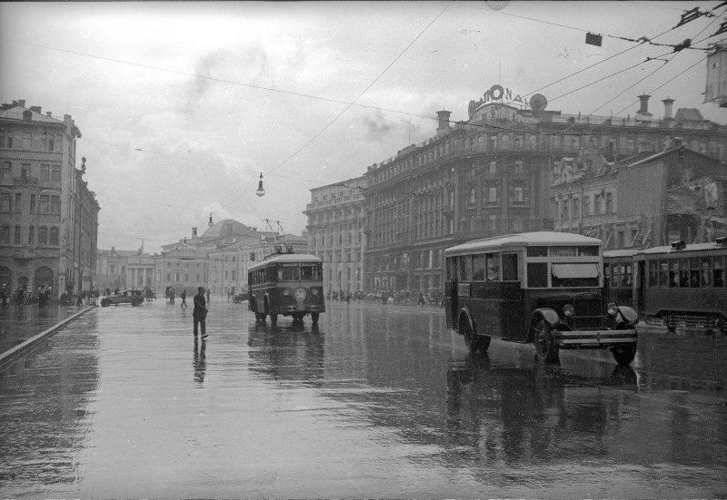 Всем, здравствуйте! Троллейбусное движение в Москве открылось 15 ноября 1933 года. Тогда троллейбусы пошли по маршруту от Белорусского вокзала до района будущей станции метро «Сокол», где был открыт первый троллейбусный парк. Постепенно троллейбусные маршруты стали замещать трамвайные. Первые машины были названы в честь Лазаря Кагановича, который и был инициатором создания в городе электрического транспорта, и получили сокращённое наименование «ЛК». В каждом троллейбусе были мягкие кресла, сетки для багажа и даже нагреватели. Изначально троллейбус рассматривался как пригородный транспорт, именно поэтому первая линия была построена на окраине города. Но москвичи так полюбили троллейбусы, что их решили пустить и в центральных районах. В начале 1934 года единственный в то время троллейбусный маршрут был продлён вниз по Тверской улице до Площади Революции. В декабре того же года запустили вторую линию, она шла по Арбату. Автор этой фотографии Эммануил Евзерихин, на ней мы видим один из пе