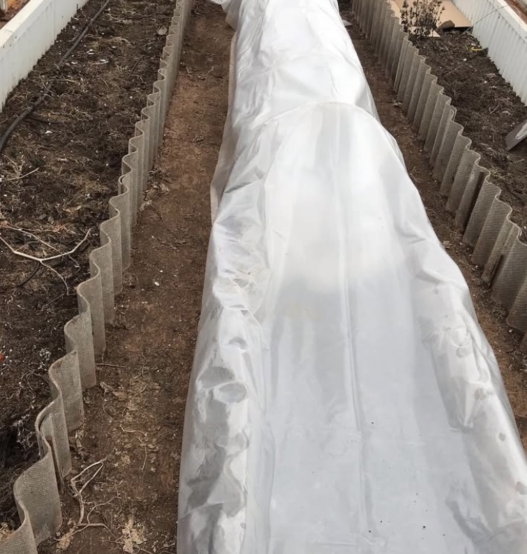 Поскольку мое раннее использование неотапливаемой теплицы вызывает у вас перманентный интерес.. остановлюсь на этом подробнее! Первое, необходимое условие - погода. Ночные т-ры не должны быть ниже -10-12*. Все таки главная угроза для рассады ночные морозы.. известно, что без солнца в теплице так же, как на улице... но, разве тока, без ветра. Нет, никто не собирается тащить страдальцев в ледяную теплицу..поэтому сначала готовим плацдарм.. Проливаем грунт горячей водой. У меня, допукрытием служит шестиметровый парничок, вот я 6 метров и полила. Хватило двух 12-ти литровых леек. Затем, тот же участок проливаем Байкалом, чтобы запустить в грунте «нужные» процессы. Для рассады, от этих процессов, полезным будет выделяющееся тепло. Сверху устанавливаем парничок со спонбондом 60-кой и, + дополнительно, накрываем толстой парниковой пленкой... от края и до края. Наша задача прогреть землю. Под таким укрытием устанавливается микроклимат. От тающей земли сохраняется постоянная влажность, така