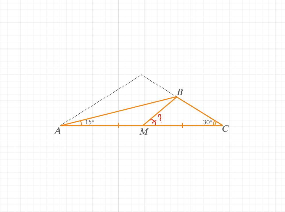 Углы, прилежащие к одной из сторон треугольника, равны 15° и 30°. Какой угол образует с этой стороной проведённая к ней медиана?