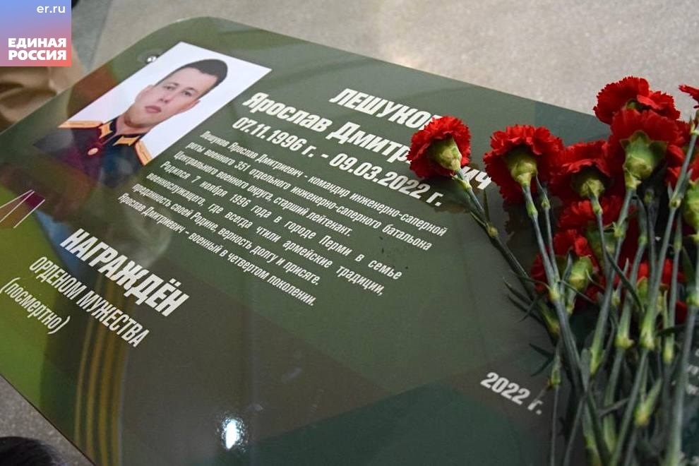 В екатеринбургской школе №166 торжественно открыли Парту Героя, посвященную выпускнику, командиру инженерно-саперной роты военного 351-го отдельного инженерно-саперного батальона Центрального военного округа, старшему лейтенанту Ярославу Дмитриевичу Лешукову.