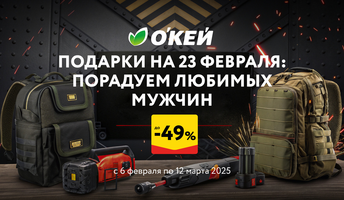 В день защитника Отечества мы обычно поздравляем всех мужчин, потому что такая у них общая цель и задача — защищать близких, свои семьи, границы страны. Все мужчины так или иначе причастны к охранительной роли. Поэтому очень важно не забывать об этой дате и относиться к ней с торжественным почтением. Давайте душевно поздравим представителей сильной половины человечества с 23 февраля, чтобы они почувствовали свою значимость. Гипермаркет О'КЕЙ уделил особое внимание товарам для мужчин и предлагает отличные скидки от 15 до 49 процентов. До 12 марта вы можете приобрести подарки для своих любимых по очень комфортным ценам. Диапазон подарков Мы предлагаем посетить сразу несколько отделов в магазине, потому что в каждом из них можно найти что-то в подарок вашему защитнику. У нас есть товары для разных сфер жизни мужчины: • одежда, белье, обувь; • товары для ухода за собой; • инструменты для ремонта и ремесел; • автотовары; • техника для развлечений. Расскажем вам про самые актуальные и поле