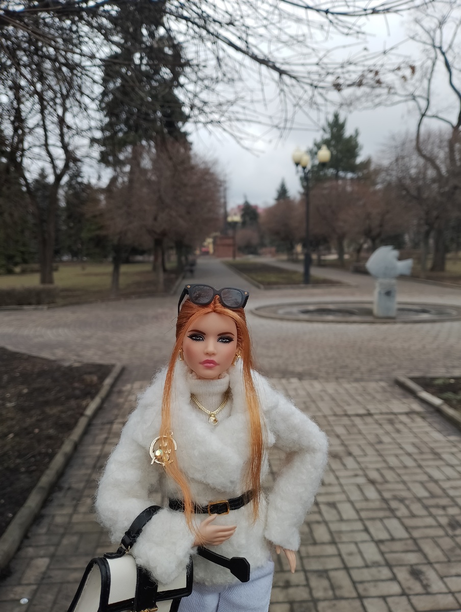 Приветствую, дорогие читатели и любители кукол! Я писала о том, что рыжая Андра - первая кукла, получив которую, я очень огорчилась. Но если ещё пол года назад я бы решила, что её обязательно надо продать и поскорее убрать с глаз долой, то сейчас моё настроение изменилось. Я как-то стала очень прикипать к своим куклам и сам процесс продажи мне проходить не хочется. А раз не хочется, решила идти по пути - "стерпится, слюбится"😉 И в первых числах февраля я взяла с собой в путь Андру, одев её в "городском" духе, насколько позволяла моя одежда и аксессуары. Мне очень пригодились черные очки из шарика ZURU и сумочка оттуда же. Мы прошлись с Андрой по центру моей родной Макеевки. Начали с центрального сквера. Погода была в тот день хмурая, холодная, слегка пронизывающая (февраль всё же), а Андрюша казалось чувствовала себя в своей стихии😁 Честно говоря, после этих фотографий я как-то к ней прониклась. Мне правда очень нравится, когда у неё собраны волосы, видимо, потому что это убирает