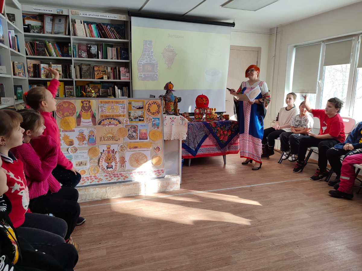 Библиотекарь Елена Марьина познакомила детей с традициями празднования русской Масленицы.