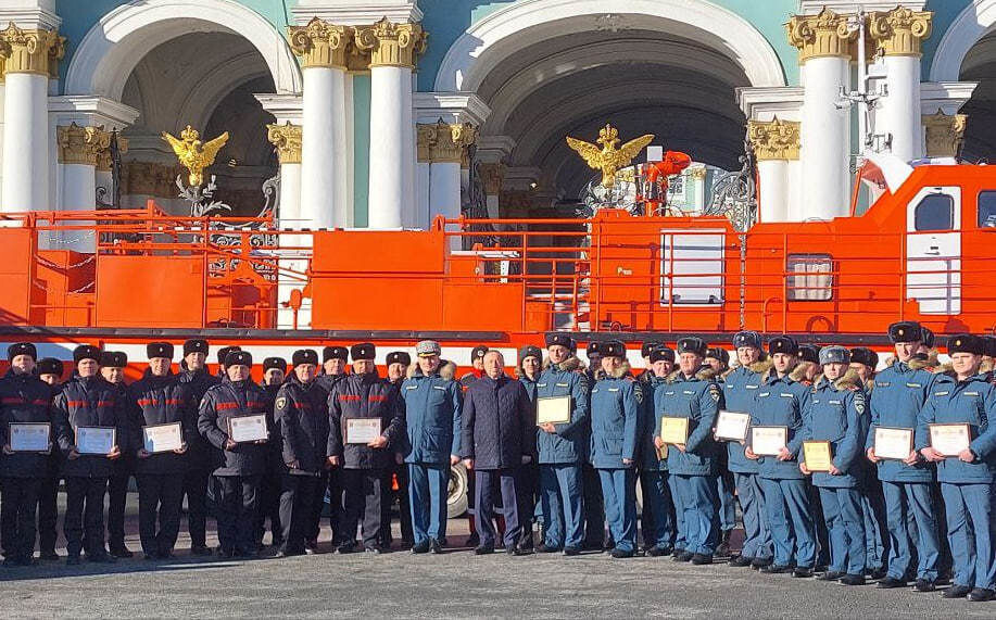 На Дворцовой площади состоялось вручение пожарно-спасательному гарнизону Санкт-Петербурга новых образцов пожарно-спасательной техники. Губернатор Петербурга Александр Беглов передал 39 образцов техники различного назначения, среди них 9 пожарных автоцистерн и 12 автолестниц от 30 до 50 метров. А также спасательные суда, в частности 17-метровый пожарно-спасательный катер для проведения спасательных работ и работ по тушению пожаров на воде, гидроциклы и другие образцы. Глава города передал работникам МЧС сертификаты на новую технику. После этого он вместе с главой МЧС России Александром Куренковым провел краткий осмотр переданных образцов машин. Ранее сообщалось, что в Петербурге дали старт памятным мероприятиям в честь погибших пожарных. Ежегодное мероприятие проходит в преддверии 23 февраля. В этот день в 1991 году при тушении пожара в гостинице «Ленинград» погибли девять огнеборцев. В память обо всех погибших в борьбе с огнем пожарных с 1995 года в Петербурге проходит турнир по футбол