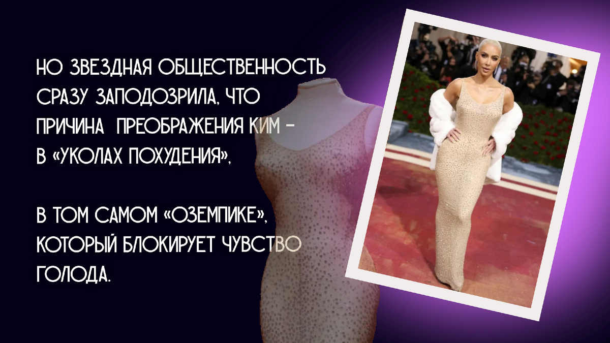 Все популярные боди-тренды обычно начинаются с селебрити. Так в 2022 году Ким Кардашьян вышла на красную дорожку Met Gala в том самом «голом платье» Мэрилин Монро. Все были шокированы изменениями ее фигуры, ведь стандартные размеры ее легендарных бедер не позволили бы надеть такой наряд. Она похудела за месяц на 7 кг, при этом сама Ким говорила, что все дело в диете и фитнесе.