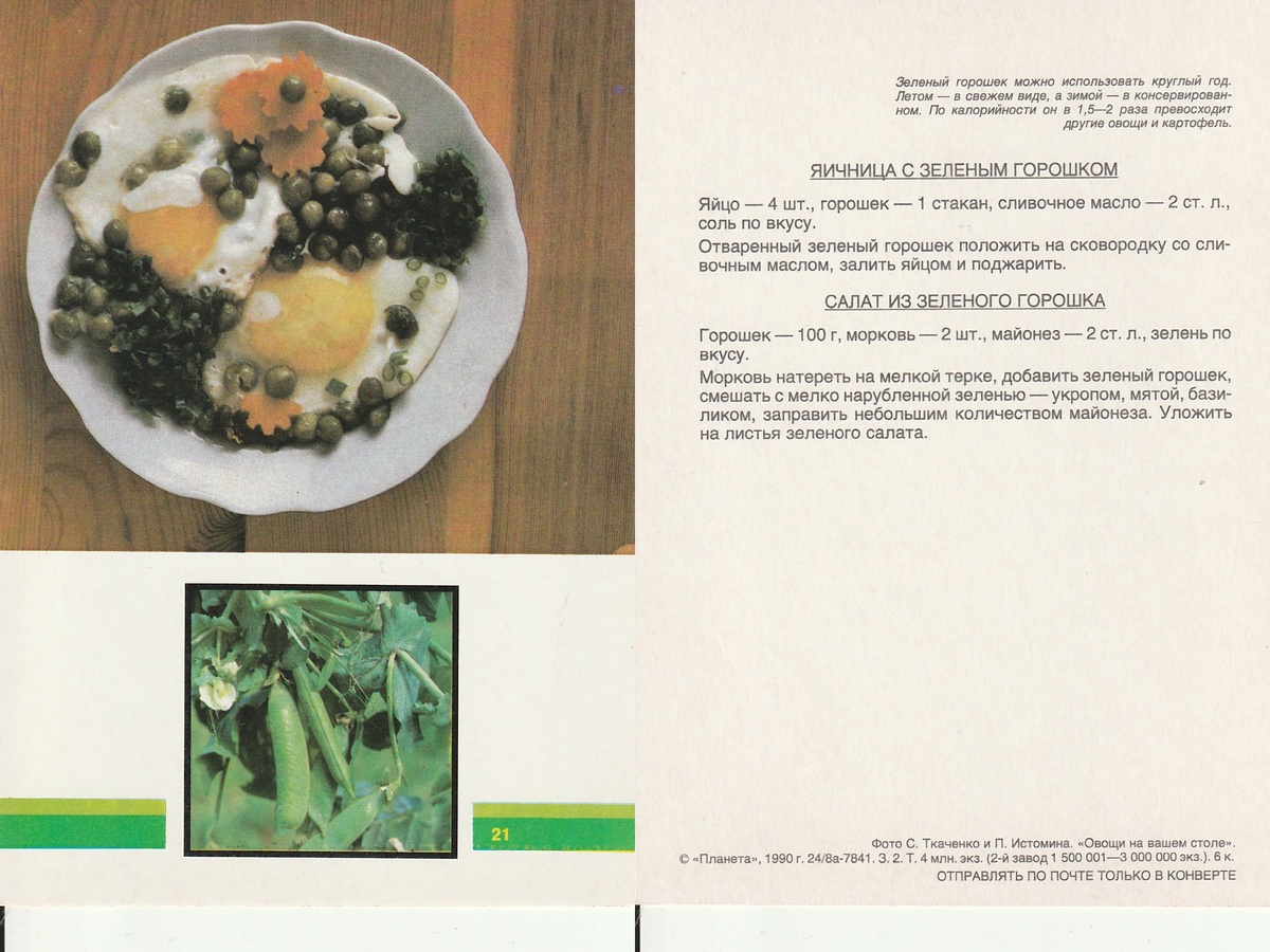 Привет, друзья! Сегодня поговорим о продукте, который многие недооценивают, а зря! **Зеленый горошек** — это не просто баночка из супермаркета. Это кладезь витаминов, универсальный ингредиент и настоящий герой кулинарной истории. А еще мы поделимся с вами рецептами из редкого издания 1990 года, которые точно стоит попробовать! --- ### **🔍 Интересные факты о зеленом горошке** 1. **Древний и могучий** Горох выращивали еще в каменном веке! Археологи находили его следы в раскопках на Ближнем Востоке и в Европе. А в Древнем Китае горошек считали символом богатства и плодородия. 2. **Космический путешественник** В 2016 году ученые вырастили горох на МКС. Оказалось, что в невесомости он растет быстрее, чем на Земле. Может, скоро будем есть «космический» горошек? 🚀 3. **Калорийность — не главное** В тексте упоминается, что горошек в 1,5–2 раза калорийнее других овощей. Но не пугайтесь! Его калории — это **растительный белок** (до 6 г на 100 г), клетчатка и витамины