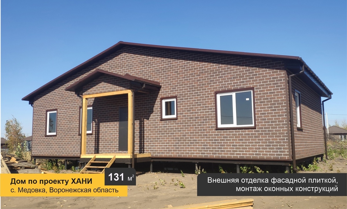 От фундамента - до системы водоснабжения и канализации. Заходи и живи! Именно таким масштабным получилось строительство СИП-дома по проекту «Хани» в с. Медовка Воронежской области. Всего 12 недель! И последним этапом стал монтаж системы отопления – водяного тёплого пола. И уже этой зимой хозяева оценили, как тепло и уютно в «канадском доме», когда за окном русские морозы. Оцените и вы – наш фотоотчёт и подробное описание материалов и видов работ по проекту. Дом из СИП панелей по проекту Хани С. Медовка, Воронежская область. S дома = 131м2 Полный комплекс работ: Фундамент: - Винтовые металлические сваи 108 мм, цементно-песчаная засыпка, оголовок 250х250 мм - Обвязочный брус 200х200 мм Пиломатериал: - Камерная сушка с обработкой огне-биозащитой Neomid - Калиброванный брус/доска Сборка дома из СИП панелей: - пол 174мм - стены 174 мм - чердачное перекрытие 174 мм - высота потолка 2,8 м Монтаж кровли: - Мягкая черепица Shinglas от Технониколь, подшив свесов перфорированным софитом Docke, во