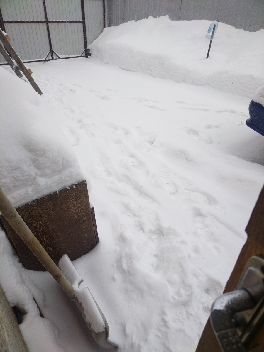 18 февраля. Снега намело. Немного, но ведь и то что выпало надо сгребать, вычищая двор. Берусь за лопату. На фотографиях посмотришь - вот снег лежит. На другую фотографию глянешь - а тут его я уже вычистил. Быстро всё на фотографиях и в тексте. Оно конечно и в жизни не долго, но пока весь снег повыгребаешь - употеешь. Вот и я. Употел. Со двора перекидываю выпавший снег через забор. В тёплом бушлате, да в старых ватниках. Как тут не употеть! А вот за воротами мне снег грести нравится. Толкай лопату впереди себя и все дела. Правда раз пятнадцать надо с лопатой туда сюда сходить. Зато через забор кидать не надо! С пасмурного мутного неба продолжает сыпать подгоняемый ветром мелкий снежок. Село, из-за этого снежка, будто в лёгкой дымке. Снежная дымка. Решил после уборки снега немного поколоть дрова. В итоге... и правда немного поколол! Чурок пять! Правда тут такие чурки, что расколов пять чурок, кажется что куча дров уменьшилась вдвое😁. Можно конечно сказать, что погодка