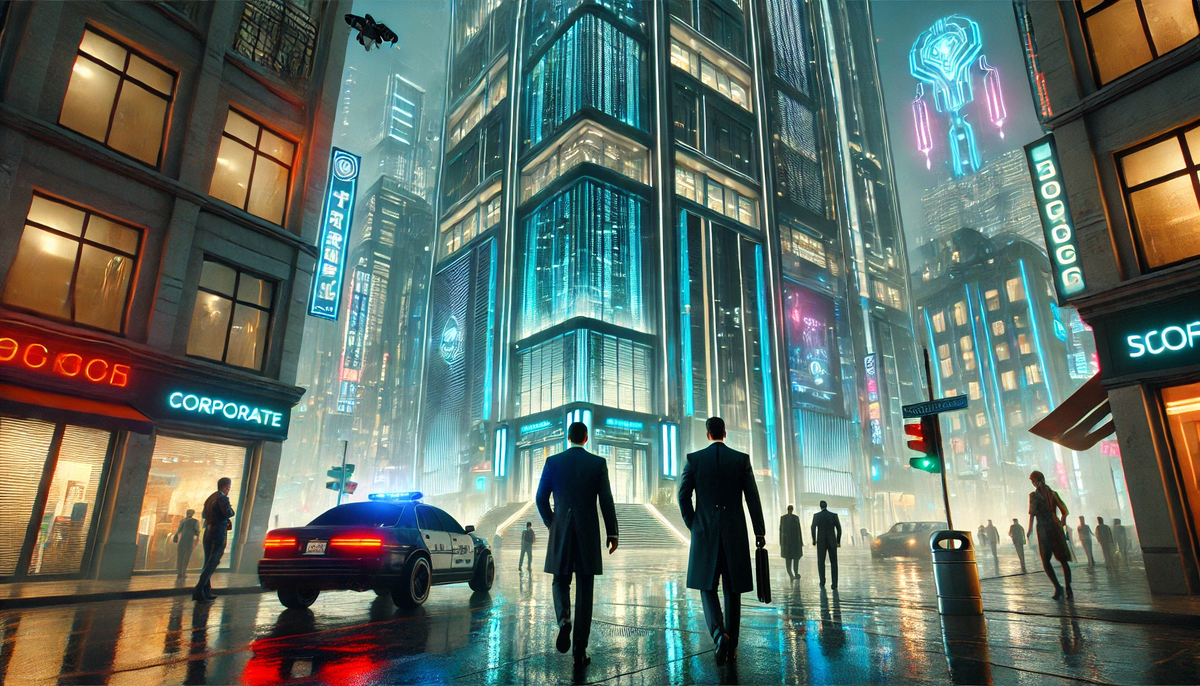 Райан «Грей» Хант едва заметно поправил микроскопический передатчик в ухе, стараясь не привлекать внимания. Он был одет в дорогой чёрный костюм, на вид — типичный корпоративный бизнесмен, возможно, топ-менеджер среднего звена. Рядом с ним шёл его напарник — Вик «Шэдоу» Ли, азиат с хищными чертами лица и холодным взглядом. Его костюм сидел не менее идеально, но под ним скрывались пластины бронепокрытия и лёгкие кибернетические усилители мышц.