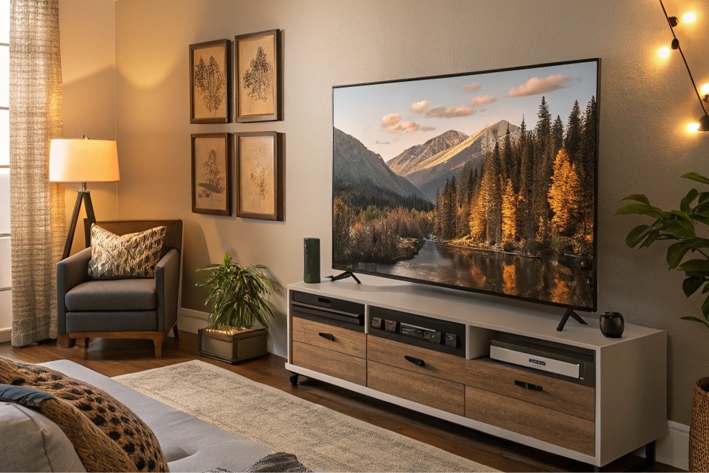 При выборе диагонали следует также принимать во внимание особенности планировки помещения, расположение окон и источников света. Оптимальным считается размещение телевизора на стене напротив места просмотра. При этом высота установки должна обеспечивать комфортный угол обзора, когда центр экрана находится примерно на уровне глаз сидящего зрителя.