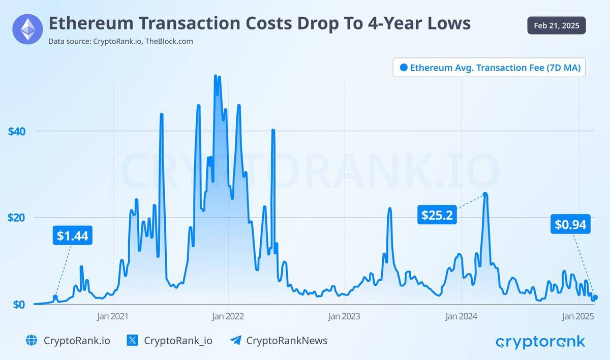 Стоимость транзакций в Ethereum упала до 4-летнего минимума 🚀