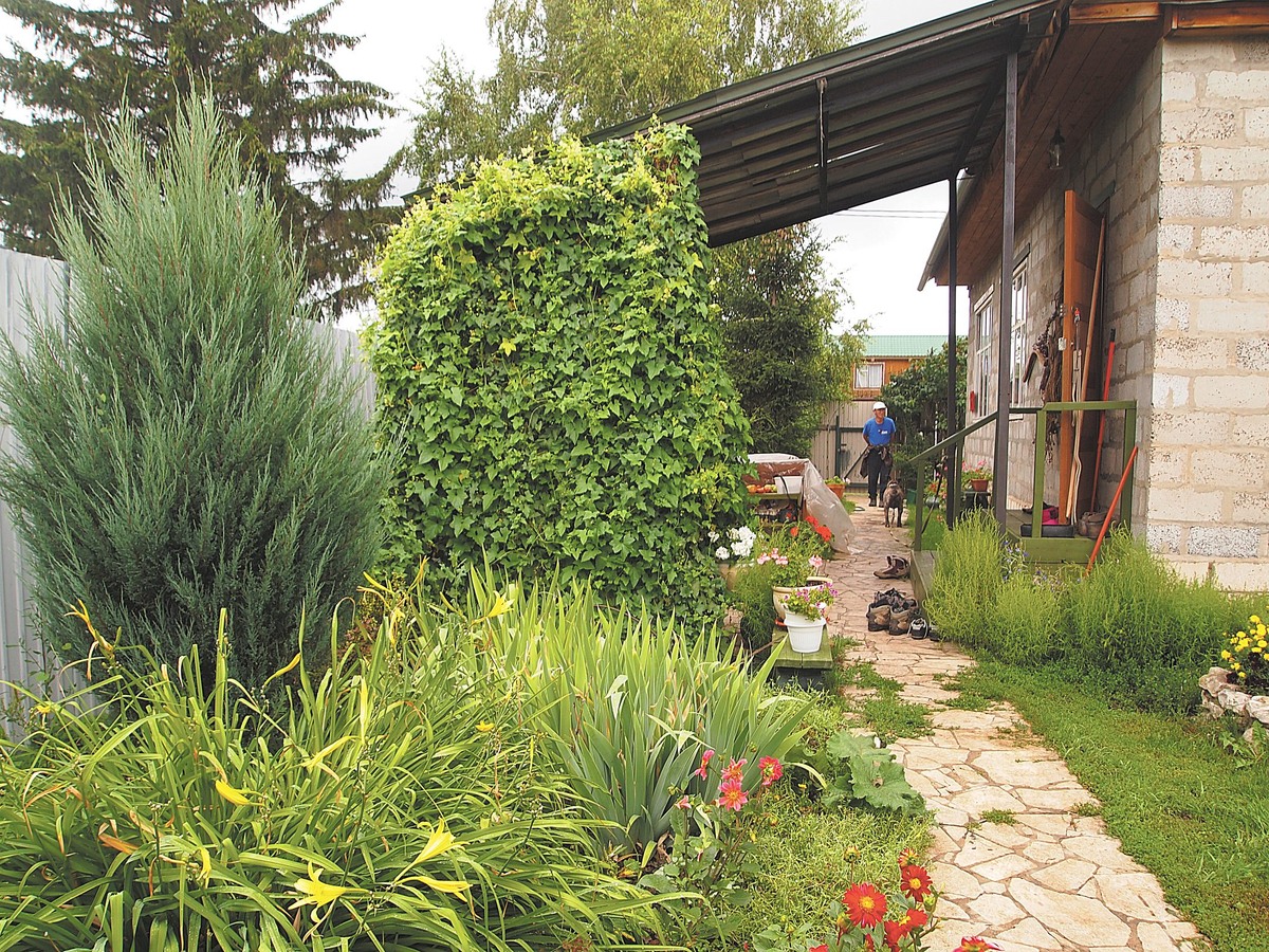 По такому же принципу в композиции располагают красивоцветущие кустарники (курильский чай, древовидные пионы, спиреи, гортензии, полиантовые розы, низкие кизильники) или сравнительно невысокие хвойники — конусовидную ель канадскую, колоновидный можжевельник обыкновенный и другие.