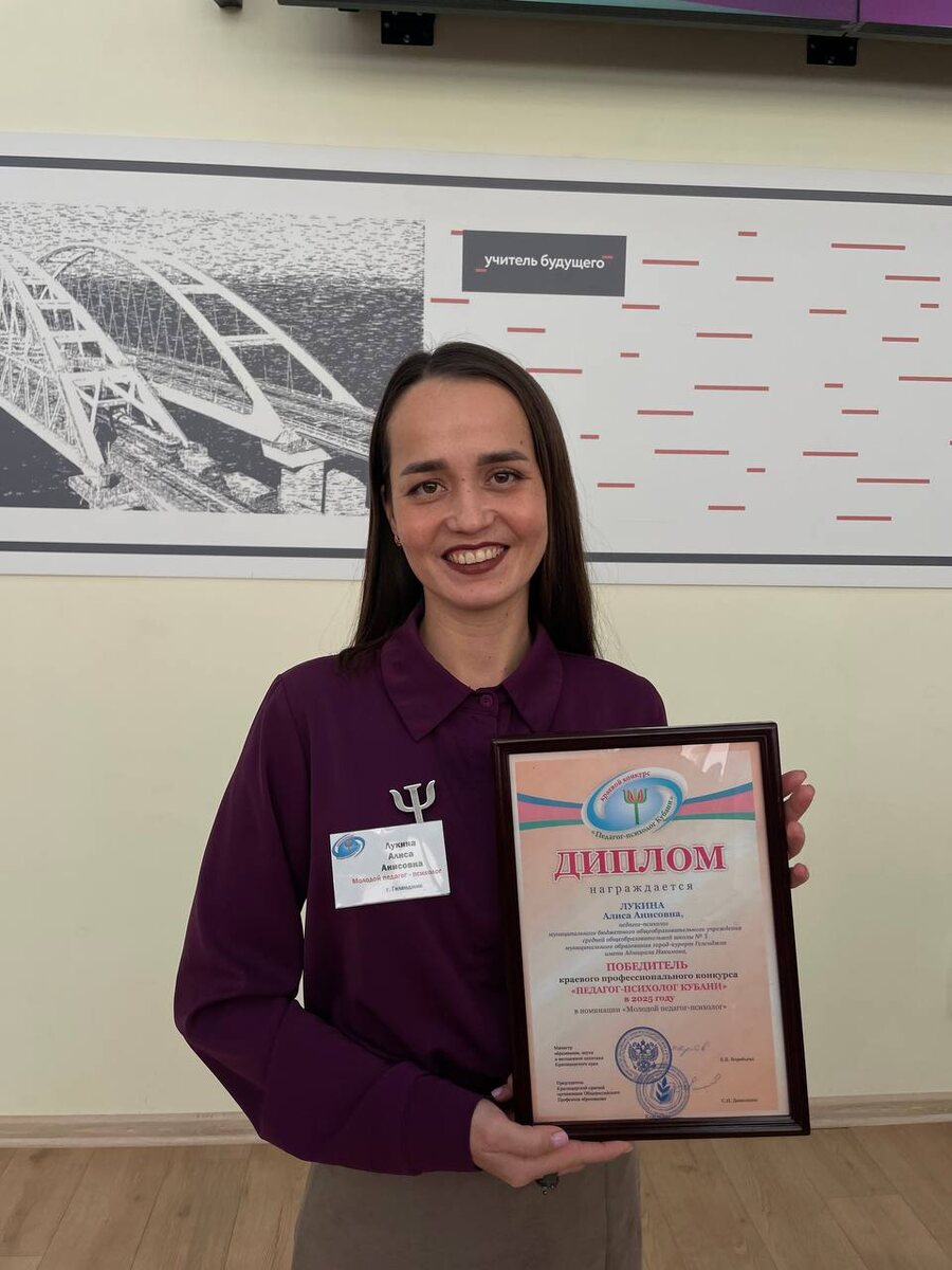В краевом Институте развития образования подвели итоги профессионального конкурса "Педагог-психолог Кубани". В этом году в конкурсе приняли участие 46 педагогов из 39 городов Краснодарского края. Участники представили анализ своей работы в учебных заведениях и поделились психолого-педагогической практикой. В номинации "Молодой педагог-психолог" победу одержала Алиса Лукина из школы №3 им. адмирала Нахимова Геленджика. С заслуженной победой нашу землячку поздравила заместитель главы региона Анна Минькова, пожелав новых достижений и успехов в профессиональной деятельности. Следующий этап соревнований – финал Всероссийского конкурса "Педагог-психолог России".