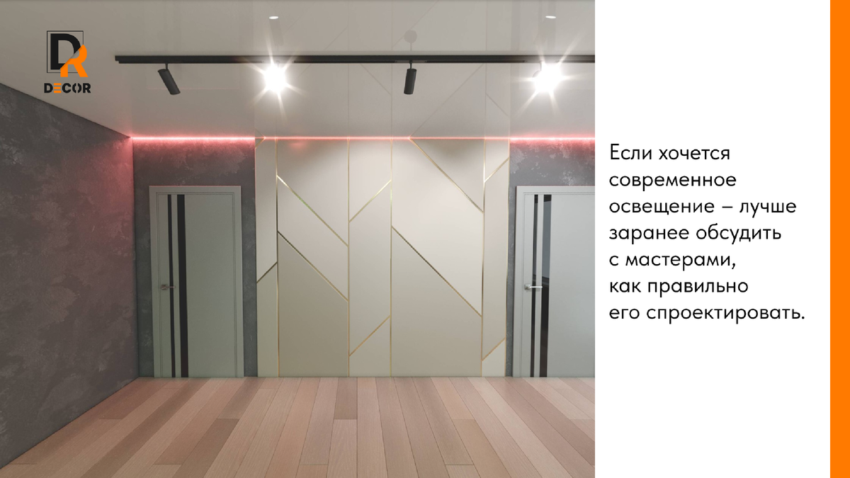 Привет! На связи DECOR. В этой статье разбираем, какие потолочные решения попали в списки трендов натяжных потолков в 2025 году. А в конце расскажем про ТОП-5 позиций, которые заказывают в Нижнем Новгороде. В интерьерах, освещении и потолках, как и во всем, что касается красоты и стиля, есть тренды. Вы и сами это замечали, если хоть раз использовали для описания обстановки что-то вроде “бабушкина квартира” или “ремонт из нулевых”. Они не такие быстрые, как в одежде, но тоже имеют свойство меняться. Давайте посмотрим, какие версии модных потолков предлагает интернет Что говорят: Это гибкость, стиль и будущее освещения! Магнитные светильники легко передвигать, менять сценарии освещения – хоть каждый день под настроение. Что в реальности: Да, магнитные треки – это популярно не первый год. Удобно, функционально, вписывается в любой стиль, зонируют пространство и помогают создавать сценарии света и даже интегрируется в умный дом. Совет: Часто не учитывают, что они стоят дороже обычных спото