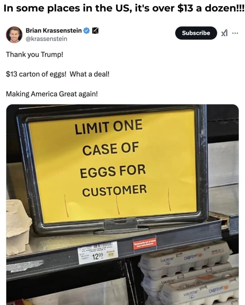 С другой стороны, введённые Трампом тарифы импорт были приторможены, они вступят в действие не сразу, переговоры с Канадой и Мексикой продолжаются. Резкое подорожание яиц началось ещё при Байдене, в конце декабря и начале января, так что Трамп может пока что списывать дефицит на тяжёлое наследие байденизма.