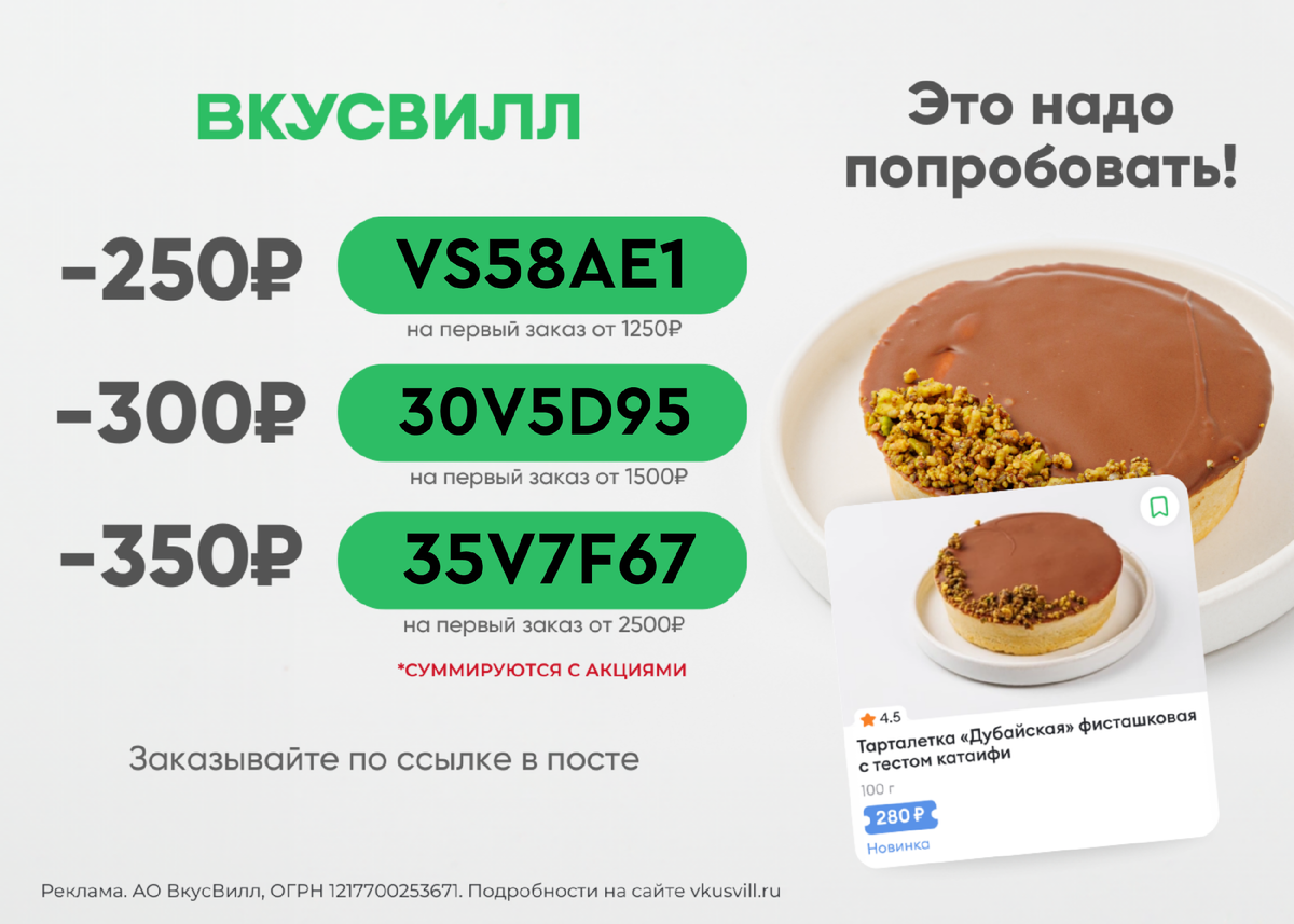 А вы уже пробовали? Скорее добавляйте в корзину новинки от ВкусВилл! ✅ Запеканка творожная с черноплодной рябиной и черной смородиной – тот самый идеальный завтрак. ✅ Смузи «Глинтвейн», 250 мл – полезный и по-домашнему вкусный, как раз для зимы. ✅ Филе «Медальон» из цыпленка-бройлера – стрипсы можно приготовить и самим. ✅ Ветчина «Классическая» в нарезке – на бутерброд, в закуску или салат. ✅ Сэндвич-ролл «По-азиатски» с куриными стрипсами и соусом терияки – когда хочется ярких вкусов. ✅ Тарталетка "Дубайская" фисташковая с тестом катаифи. ✅Набор для домашнего спа «Уютные моменты» – все для релакса. Забирайте промокоды на первый заказ: VS58AE1 – скидка 250 ₽ при заказе от 1250 ₽. 30V5D95 – скидка 300 ₽ при заказе от 1500 ₽. 35V7F67 – скидка 350 ₽ при заказе от 2500 ₽. ❗️ Действуют только на первый заказ и суммируются с другими акциями. Во ВкусВилл всегда бесплатная доставка, а в некоторых регионах – не только по городу. Посмотрите в своем приложении. За покупками сюда https://vksvl.pr